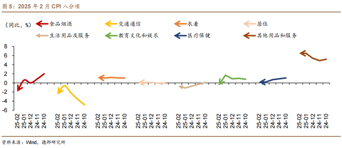(1)CPI环比来看,2015至2020年农历2月CPI环比读数集中在-1.1%-0.8%,较正月通常下行0.6%-2.3%;2021-2022年受疫情影响农历2月CPI环比中枢下行至-0.3%,较正月中枢下行0.9%;2023年至今农历2月CPI环比读数集中在-0.5%--1.0%,较正月通常下行1.3%-2.0%。纵向对比来看,2025年2月CPI环比-0.2%,较正月下行0.9%,下行幅度和受疫情影响较为严重的2021-2022年均值持平,低于2015-2020年、2023-2024年的均值-1.5%和-1.7%。因此整体来看,今年农历二月CPI环比下降幅度不大,降幅低于2015年以来除疫情之外的其他年份降幅中枢。